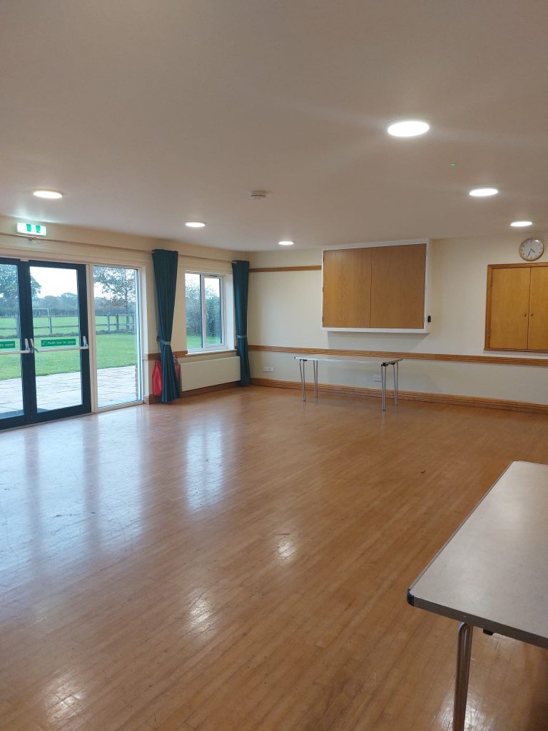 To the front of the building there is car park for around fifty cars. To the rear, an enclosed lawn and terrace. There is an adjacent children’s play area with swings and a wall for both ball kicking and netball practice. The Hall overlooks the adjoining Pilley Recreation Field.